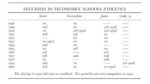 St Bede’s quickly proved to be strong in athletics no doubt due at least in part to the dedicated staff and coaches who championed the sport. St Bede’s regularly placed in the top three at the Secondary Schools Athletics competition between 1948-1960 (See table included below from the Golden Jubilee Book).