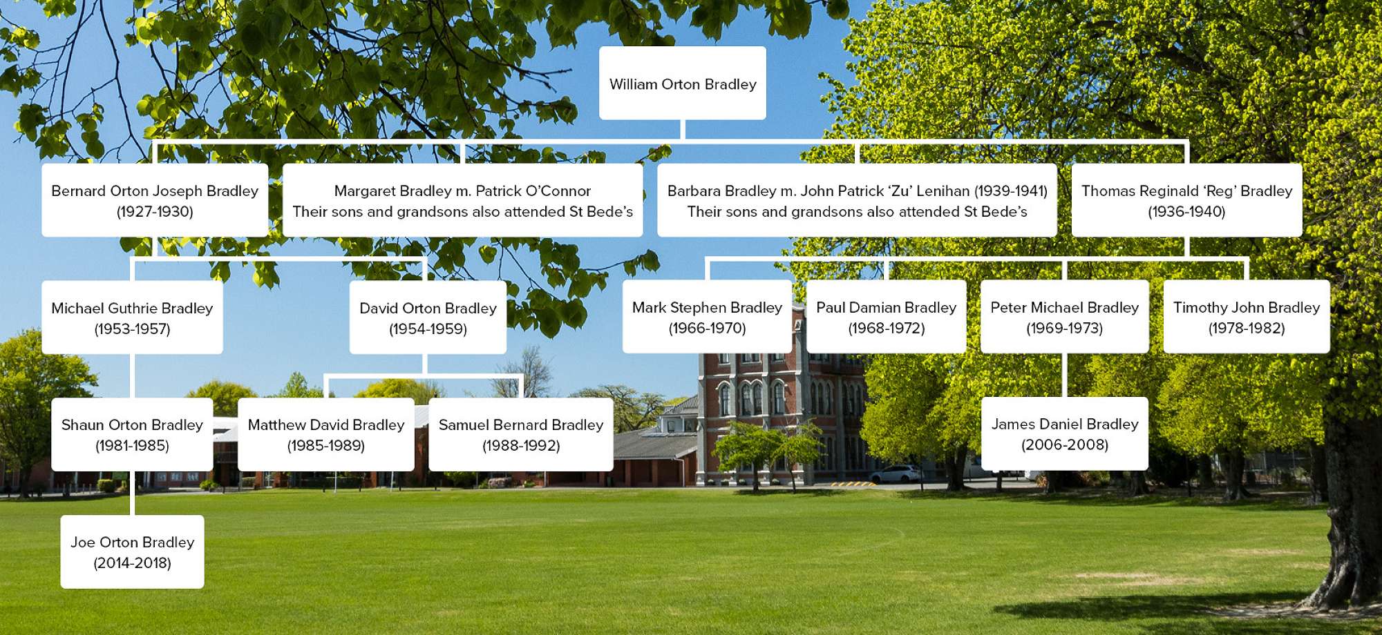 As you will see in the family-tree illustration below, William Orton Bradley's decision to send his two sons to St Bede's in the 1920's/30's, lead to a long family association with the school not only through the Bradley line but also through his two daughters Margaret and Barbara, whose family lines of O'Connor and Lenihan are equally extensive.