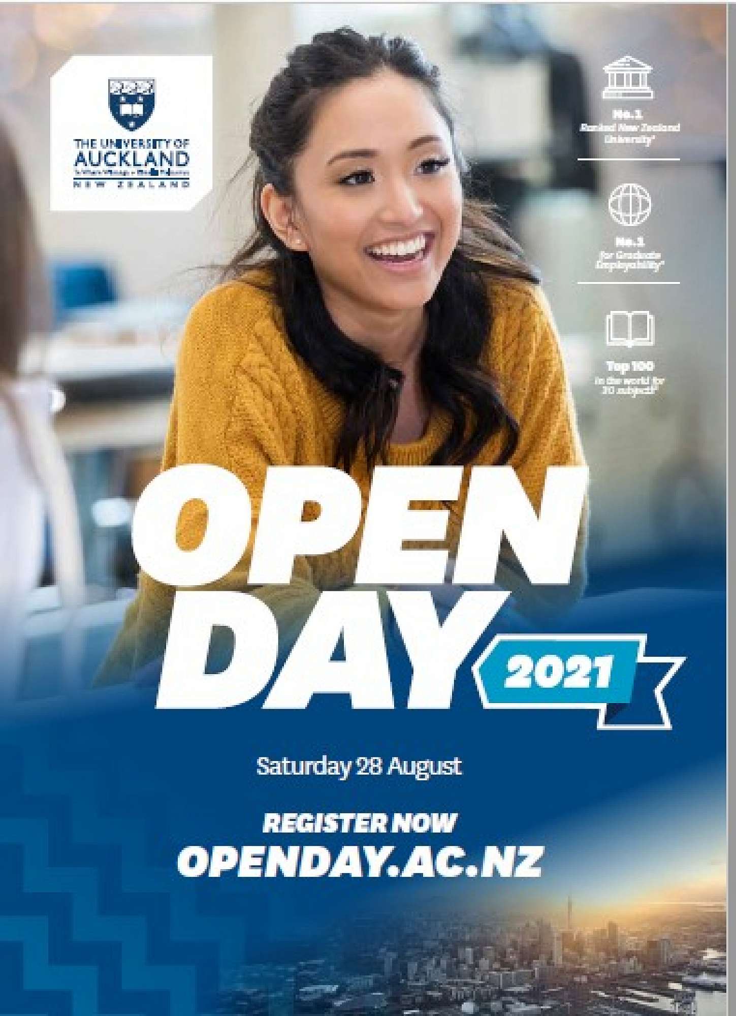 The University of Auckland Open Day 2021 will be held on campus on our City Campus on Saturday 28 August 2021 from 9am – 3:30pm.