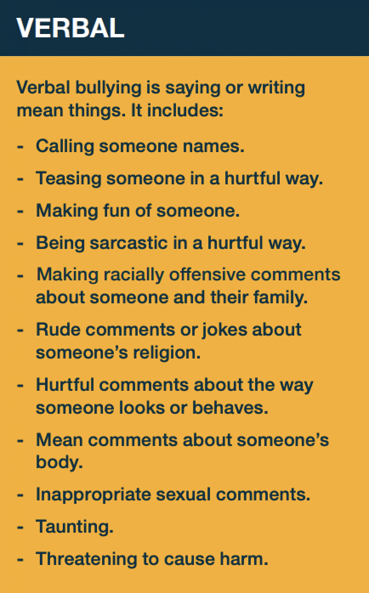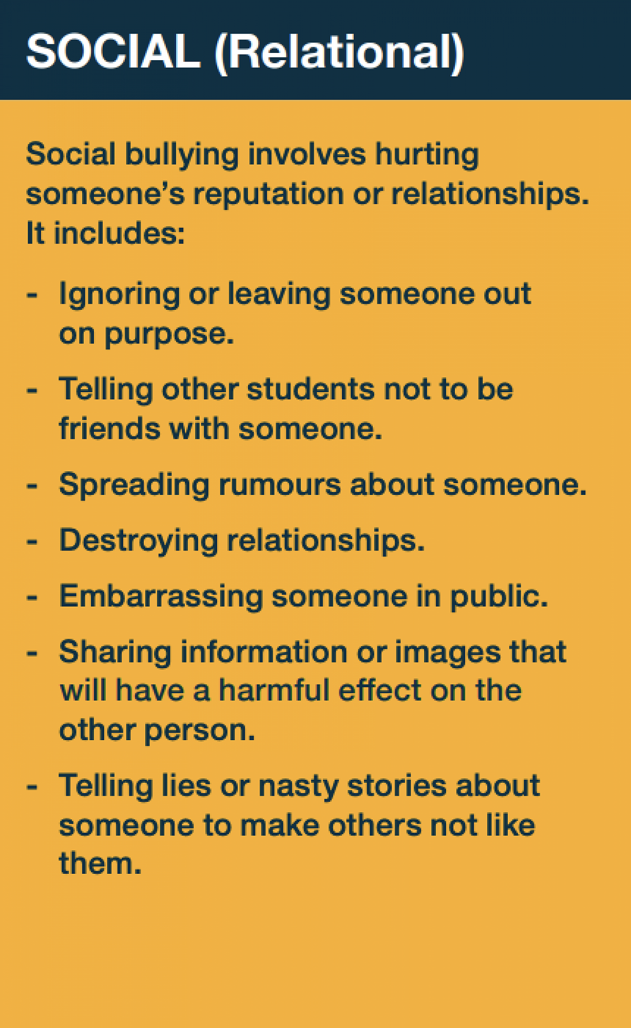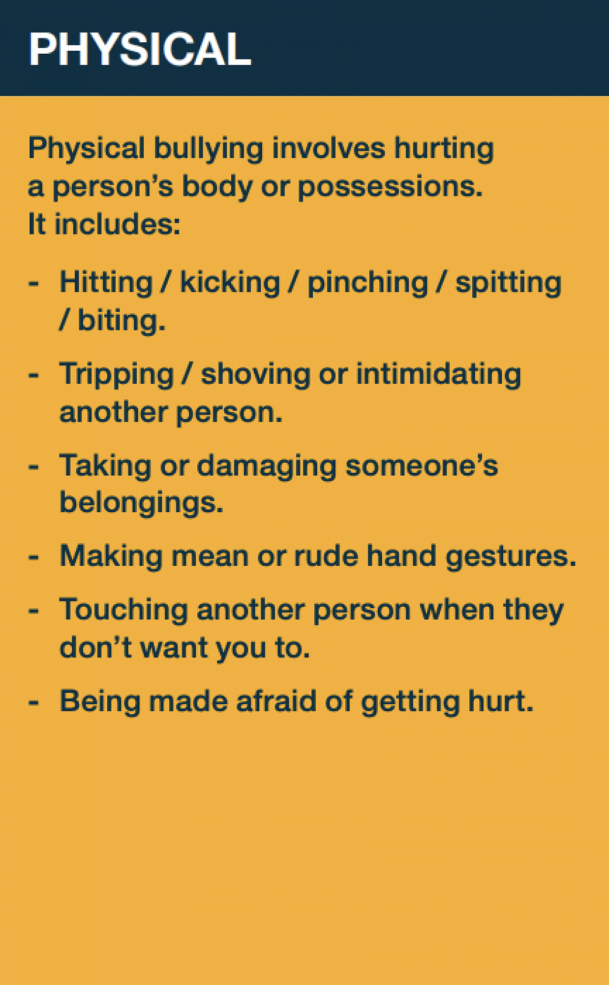 There are three types of bullying behaviour – physical, verbal and social.