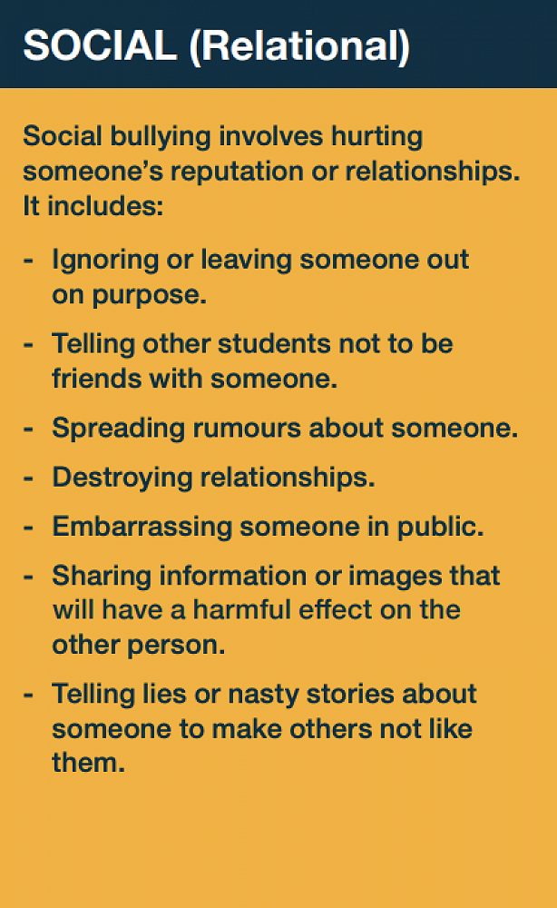 Hidden bullying can be very hard for others to see. It can include repeatedly using hand gestures and weird or threatening looks, whispering, excluding or turning one’s back on a person, restricting where a person can sit and who they can talk with.