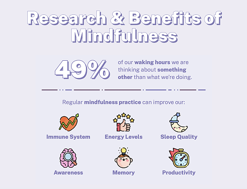 Thousands of studies into Mindfulness indicate that with regular practice, Mindfulness can lead to benefits such as; reduced stress, reduced rumination, increased memory, increased cognitive function and physical health benefits through improved immunity.