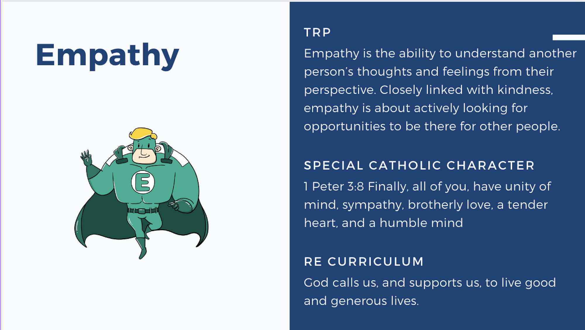 Empathy is our ability to put ourselves in the shoes of others to feel and see what they do. We practice this through being kind and compassionate towards other people.