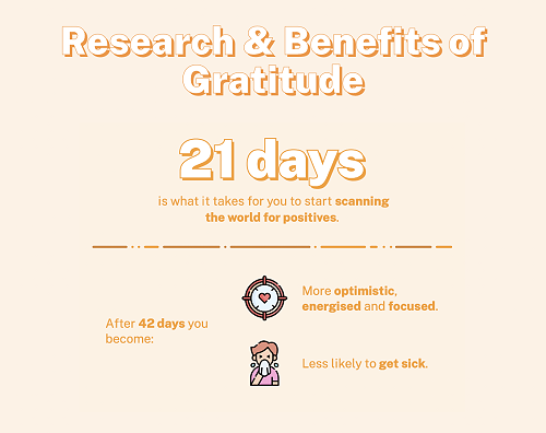 Research shows that practicing gratitude rewires our brains to overcome the negativity bias (which can lead to anxiety and depression) and see the world for what we are thankful for. It is also shown to broaden thinking, and increase physical health through improved sleep and attitude to exercise.