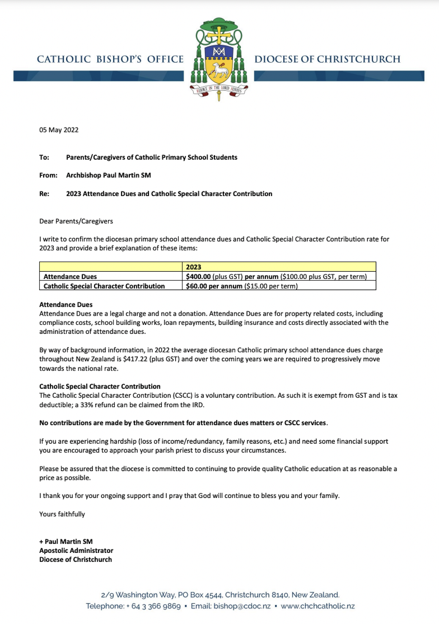 A message from the Bishop: Please see the attached letter regarding the Attendance Dues and Catholic Special Character Contribution.