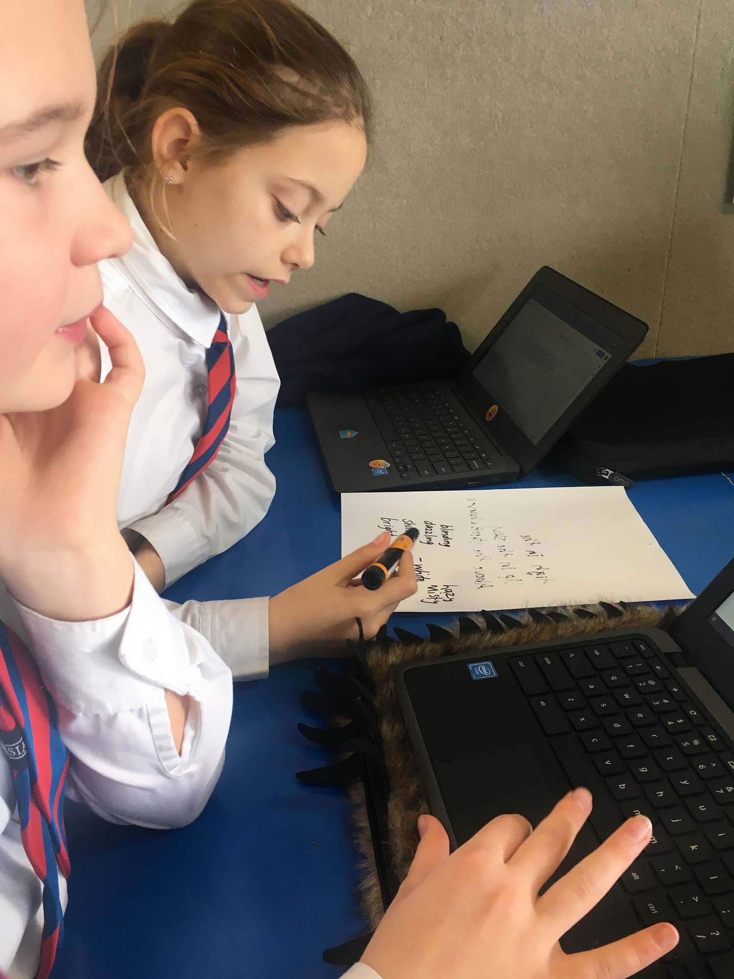 Our tamariki are learning to use a shade-o-meter to gather vocabulary for their writing and it has been great to see them collaborating on word choices in their writing. See the example below.