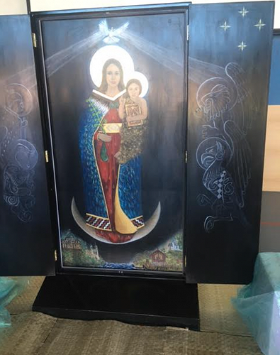 Today we were privileged to have the newly created commemorative art piece, Ho Hāta Maria, te Matua Wahine o te Atua - Holy Mary, Mother of God, at St Francis'. The artwork will be at the Pro-Cathedral for the weekend Masses.