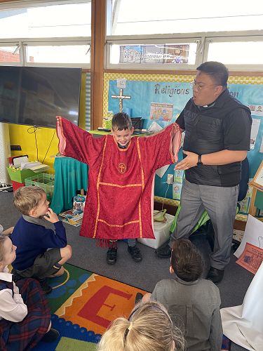 Fr Alastair visited Ashby 1-3 and taught us all about the special vestments that the priests wear at mass, and we all got to see and hold the chalices that are used to distribute, bless and store the Blessed Eucharist.