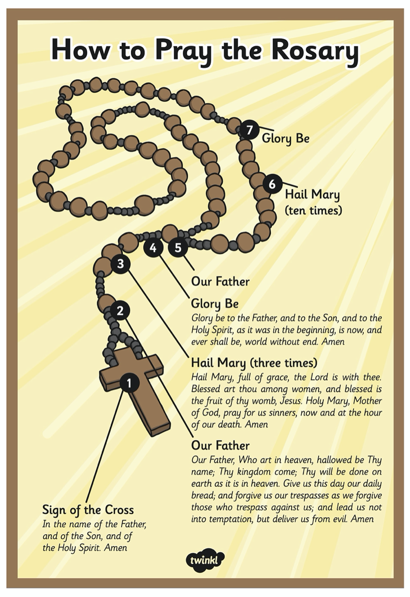 We dedicate the month of October to the Holy Rosary. Make time this week to share a decade of the Rosary with your families. The word rosary comes from Latin and means a garland of roses. The rose is a flower used to symbolize Mary the mother of Jesus. The rosary is a meditative repetitive prayer in honour of Mary. It consists of a set number of specific prayers. There are the introductory prayers: one Apostles’ Creed, one Our Father or the Lord’s Prayer, three Hail Marys, and one Glory Be. At the center of the devotion, is the Hail Mary. It is repeated 150 times during the prayer. Rosary beads are used as counters to help maintain the rhythm as the prayers are prayed in sequence.