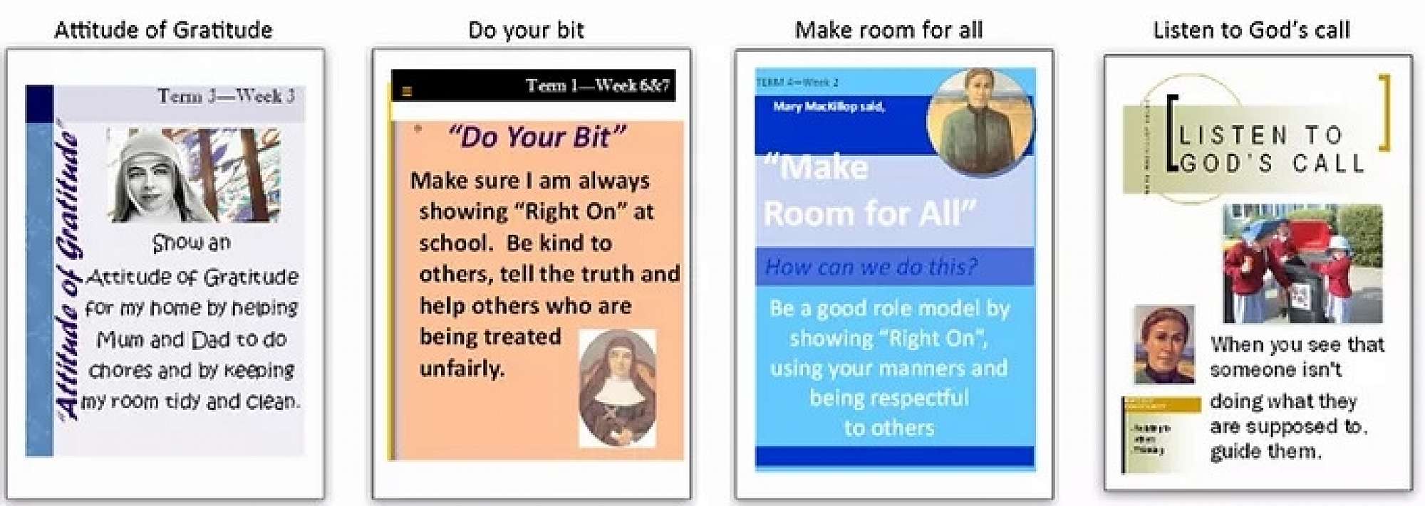 How do we live this through our school? Each term we adopt one of these values. Classes then break these down to a weekly focus to guide students during the week.