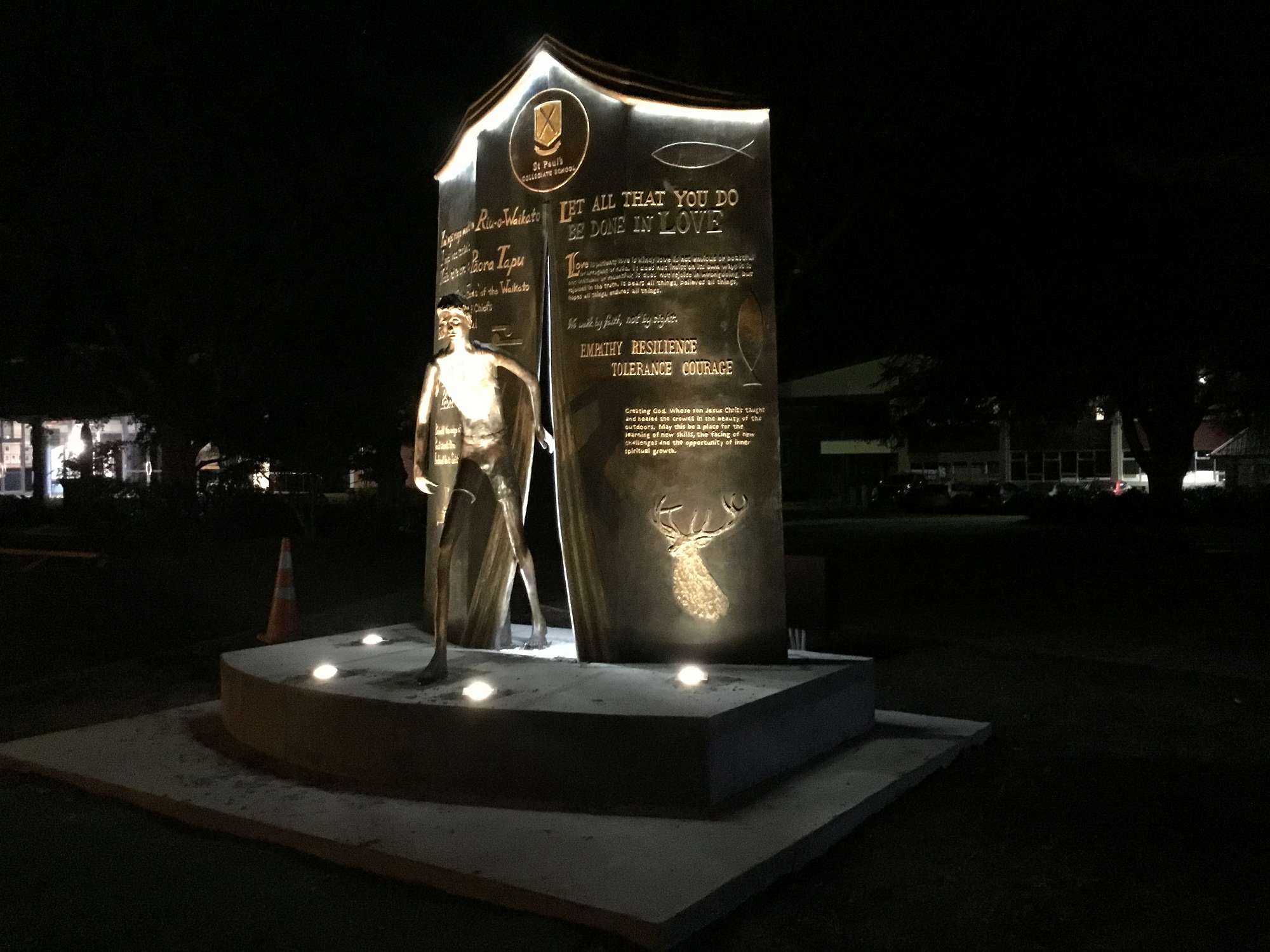 This year has been very much a year of celebration, with many special events, including: the unveiling in February of the timeline in the Sports Centre and the cutting of the cake to mark the sixtieth year of the school’s operation; through to the 60th Anniversary Collegians’ weekend events in March; the recognition of six decades of rugby at the televised 1st XV match against St Peter’s School in July; through to the honouring of the 40th year of the Tihoi Venture programme in September. On the first day of Term 4 (14 October 2019), the culmination of these unique historical milestones was marked with the unveiling and blessing ceremony for the sculpture which is to be referred to as The Journey. Commissioned last year, the sculpture was produced by one of New Zealand’s most respected artists, Mr Paul Dibble, ably assisted by his wife Fran.