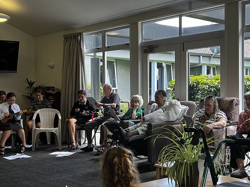 Each Tuesday, students from the School join Reverend Peter Rickman (the Rev) in a session of ukulele and singing with the residents of St Joans Rest Home. The visit is a highlight of the week for many of the residents and our students.