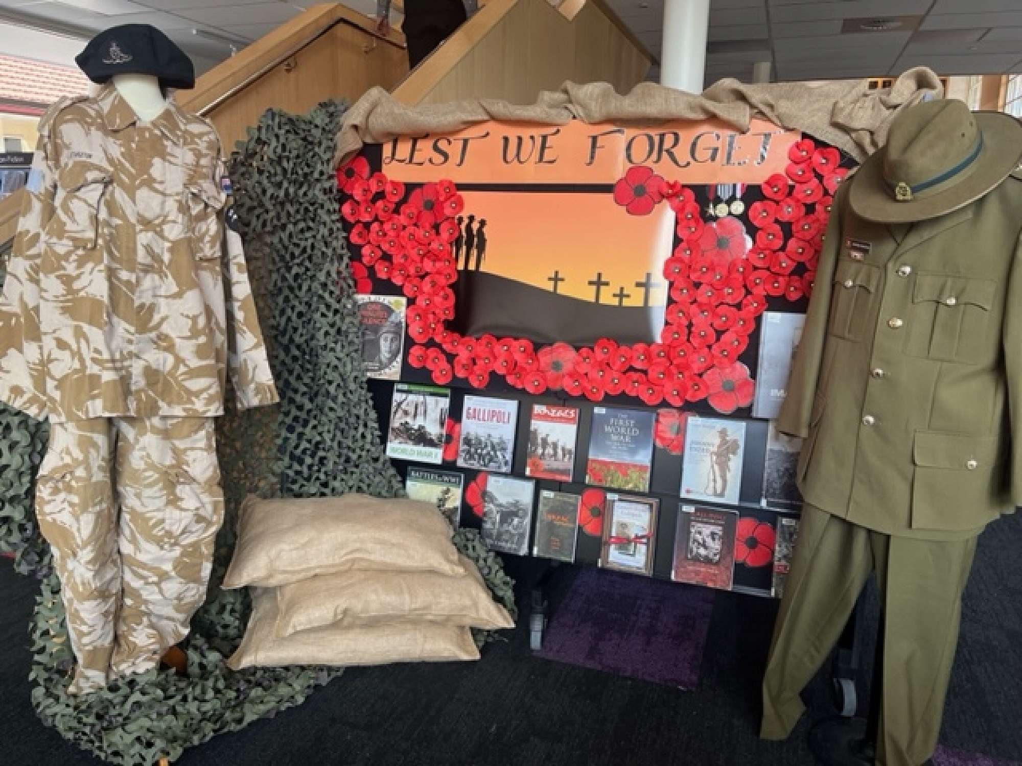 The librarian team has been busy creating displays for many of the public holidays and important anniversary days of the year. The student librarians spent hours cutting out poppies and designing and gathering props for their Anzac display. The Anzac poster was designed and created by Isobel Morton-Johnson (Year 12) and the army uniforms were kindly loaned to us by Cameron Stapleton, previous Deputy Housemaster of Clark House.