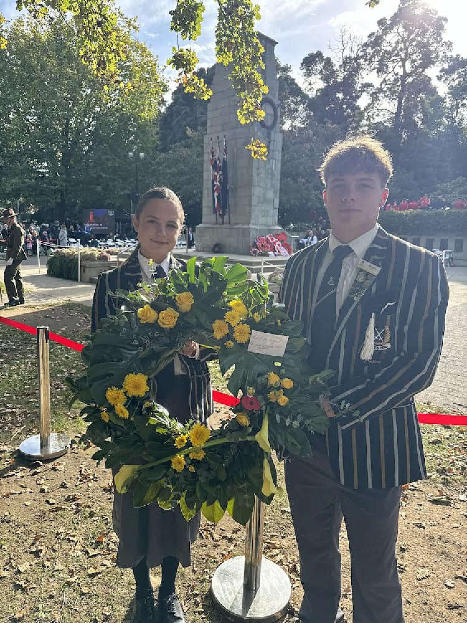 Heads of School Sadie Williams and Will Hadley lay a wreath at the ANZAC commemoration service in Hamilton. We will remember them.