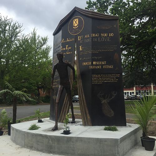 Visit this articleA bronze sculpture of an oversized student exiting a tent is the focal point to all those who drive in the school grounds and is the second piece of public art for Hamilton by accomplished sculptor, Paul Dibble.