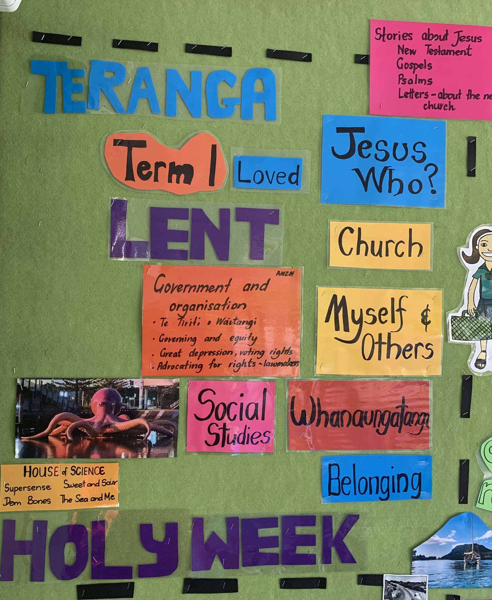 Year 1-2 RE/Social Studies. Myself and others; my people my place; my family, my school and my parish. People who help us. Whanau tapu - the Holy family. Living in Nazareth, Bethlehem and the villages on the shores of the sea of Galilee. Boats- Jesus was a fisherman, so were some of the apostles. On the Sea of Galilee- parallels the waka on the Pacific. A great way to bring in new learning about the first voyagers/sailors.....and connects to the Year 3-6.