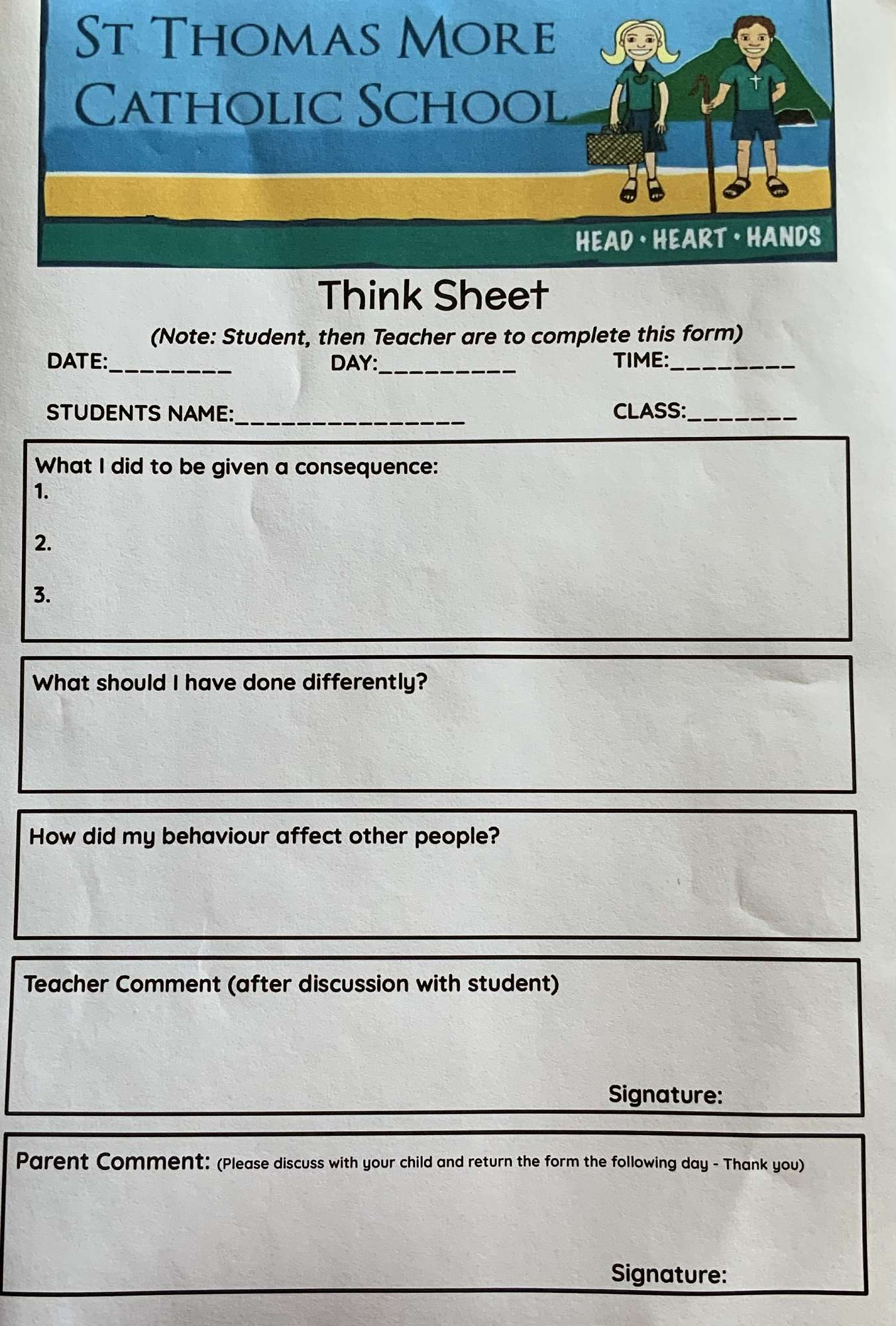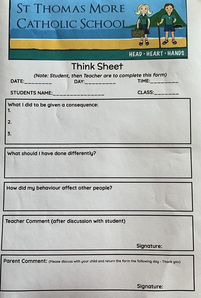 The think sheet will be signed off by the teacher and then a copy will be sent home to parents to read, discuss and sign/return to school. We will be keeping copies of 'think sheets' because they will give us - teachers/leadership - another way of tracking students who may be needing extra support.