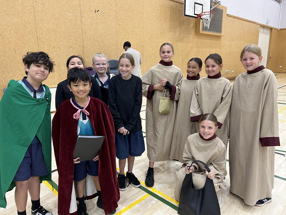 Amaya Surgenor, James Douglas-Watson, and Jeremy Leyses - Drama (The Good Samaritan): After the welcoming, we moved over to a corner to get into our costumes. Lucy didn’t have her costume so Amaya had to give her some of hers. We strolled over to the seats to wait for the first drama group. We watched the other school perform before we were called. Jeremy recalled feeling nervous when he first started, but he said his line pretty well to Brylie which was “What does the law of Moses say? How do you read it” and also “Right! Do this and you will live”. The story was about a man getting robbed (Lucy) and a good samaritan (Brooke) who walked past him then he helped the man get to the inn to take care of him, meanwhile everyone else passed the victim without helping. Then at the end we all stood up and bowed towards the people. Once we bowed, then we watched 3 other plays.