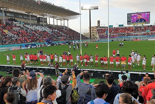 We headed to Kobe with the news a potential Category 9 Hurricane was heading to the shores of Japan. Due to this our third fixture against Konan was cancelled, as it turned our we were not badly affected by the Hurricane in Kobe. Following the Kobe visit we headed to Osaka and an opportunity to watch Tonga play USA, it was also an opportunity for us to catch up with two old boys that are playing professionally in Japan. Both Patrick Stehlin and Sione Afemui were blown away with the passionate Hakas they received from our U15 STC boy’s. A day to remember.