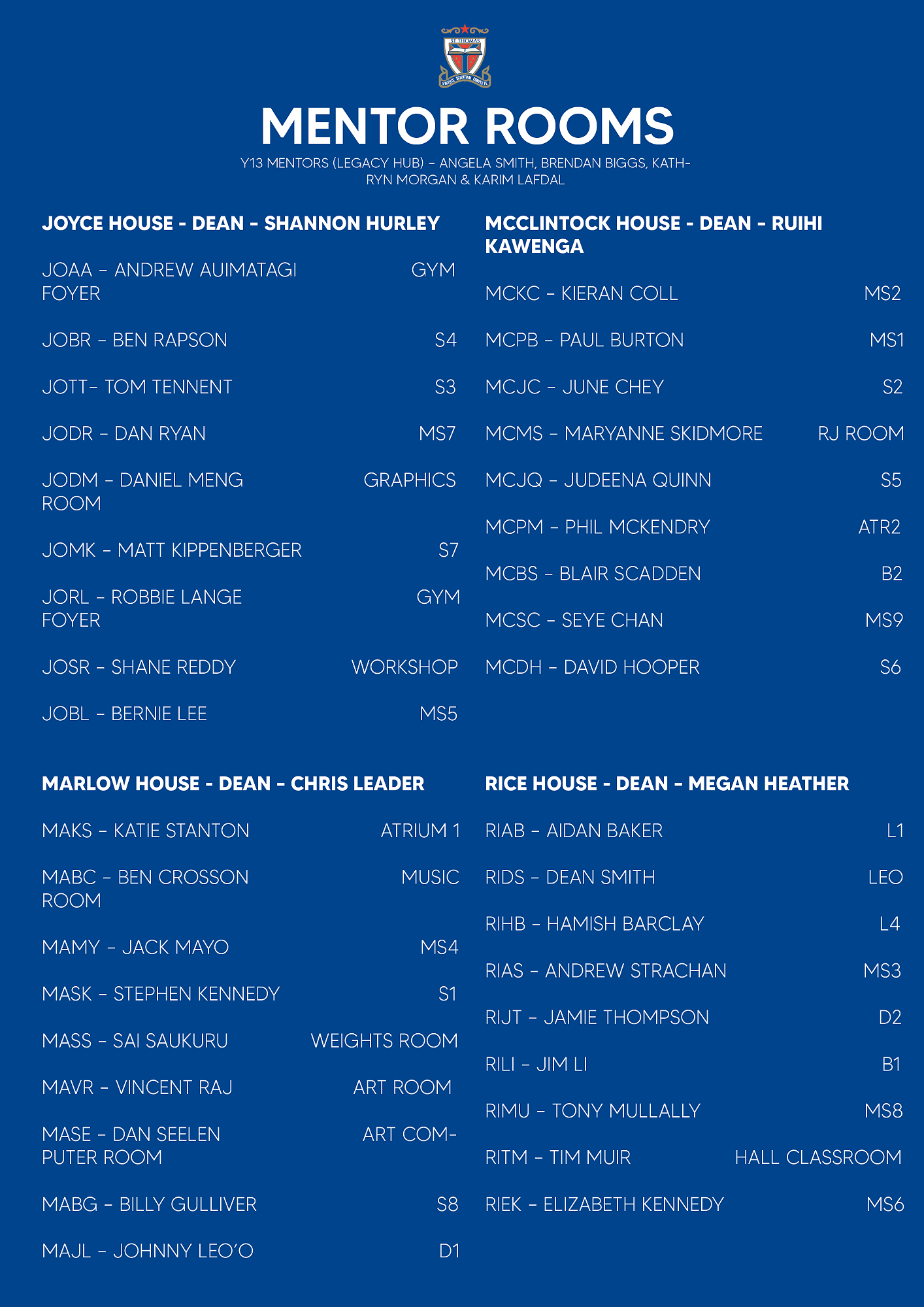 Below is a list of mentor rooms to assist you on the day.