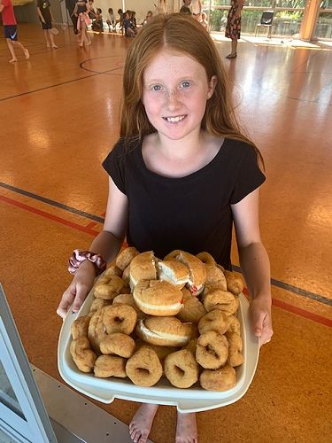 Tracey Ryan won a bet at quiz night so Saoirse and Niamh are principals for today. So in the morning, we got to go to the pool then we had donuts for morning tea after morning tea we made badges that said Deputy Principal and Principal for lunch we had pizza yum!