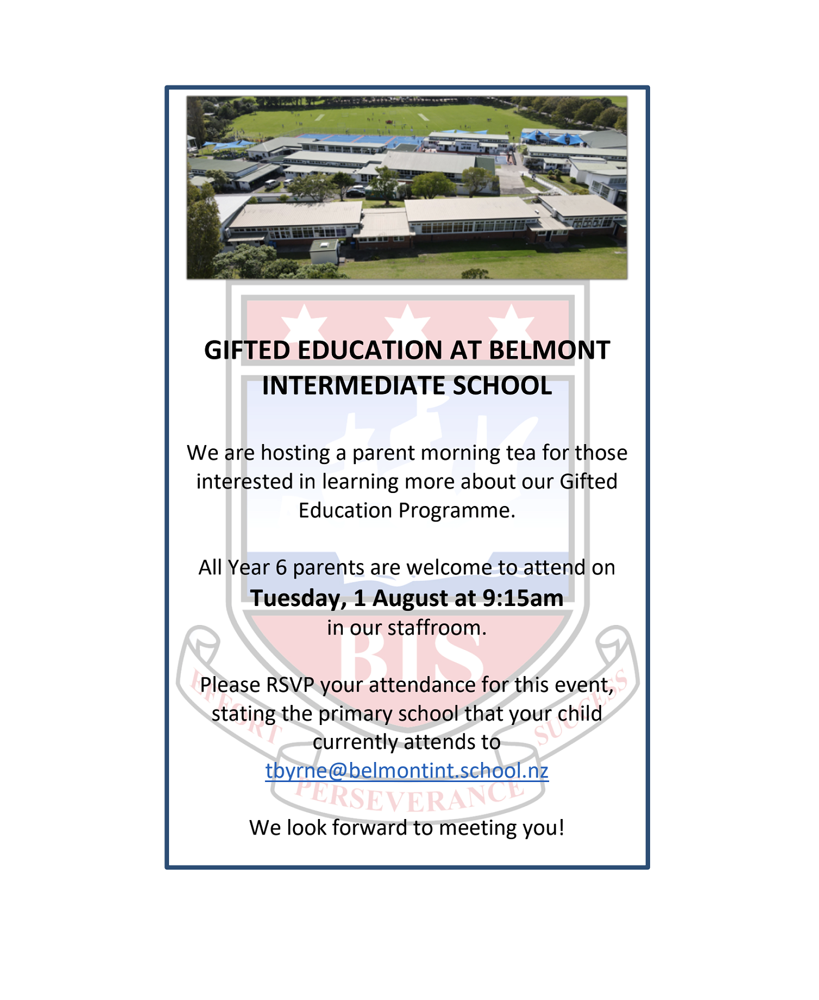 We are hosting a parent morning tea for those interested in learning more about our Gifted Education Programme. All Year 6 parents are welcome to attend on Tuesday, 1 August at 9:15 am in our staffroom. Please RSVP your attendance for this event, stating the primary school that your child currently attends to tbyrne@belmontint.school.nz.