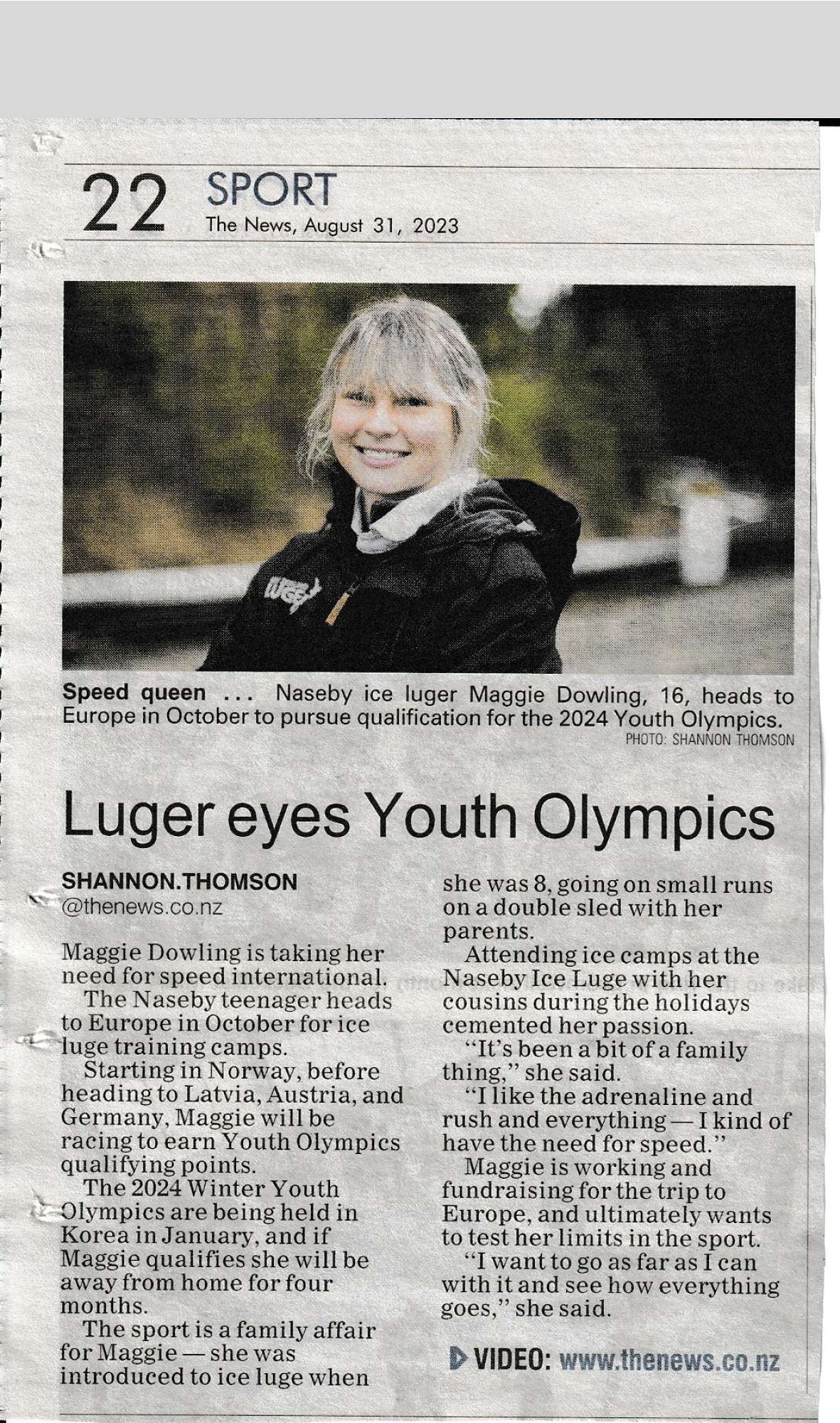 Maggie has been selected to represent New Zealand in Luge. Leaving on the 3rd of October she will train in Norway, Latvia, Austria and Germany. She will compete in five Youth World Cup races in Germany and Austria, with the ultimate goal of