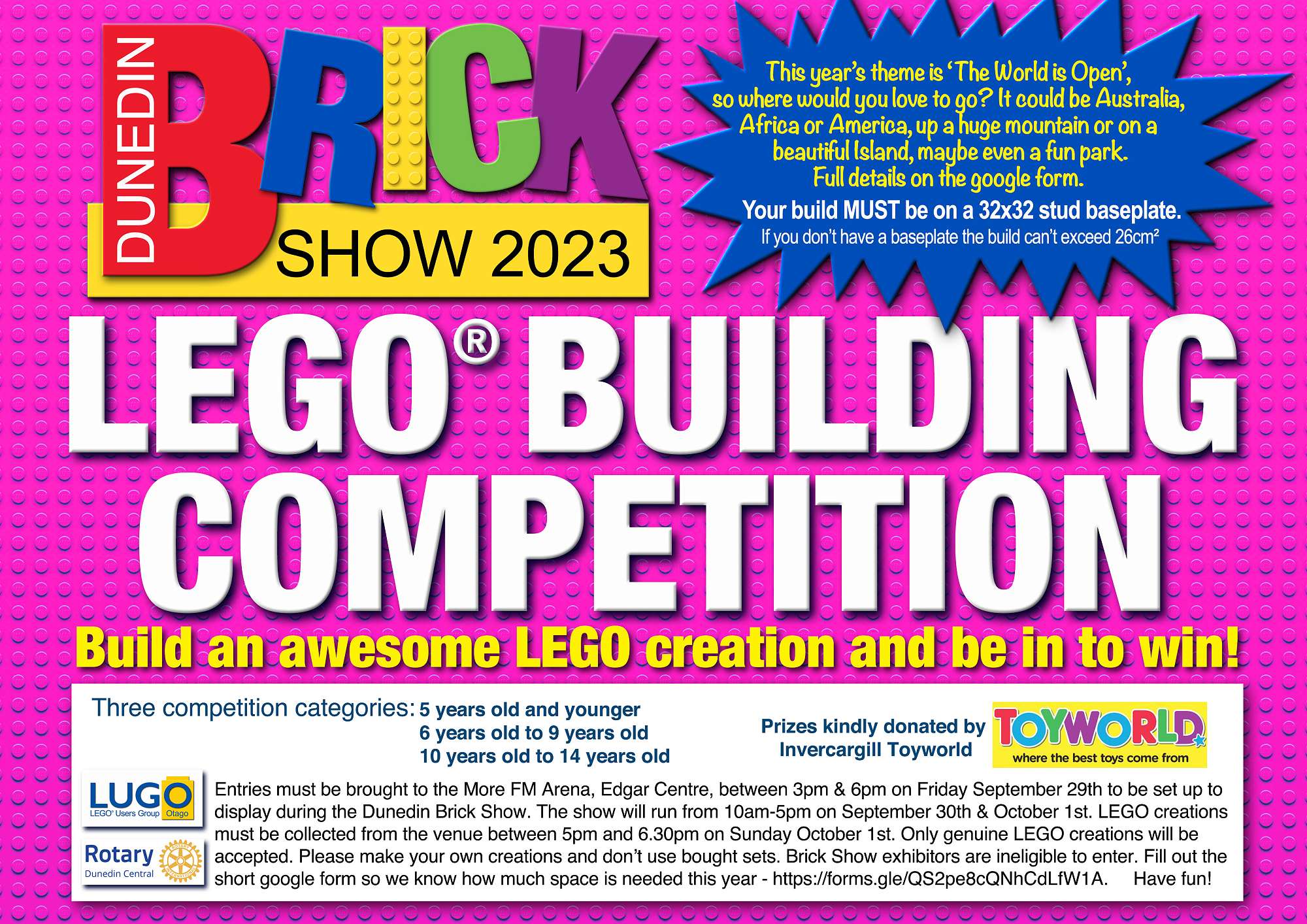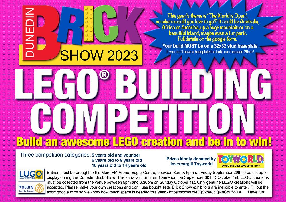 The Dunedin Brick Show is a very popular event for children of all ages. We would love to see children of all ages enjoying themselves creating with LEGO, admiring the fantastic LEGO displays and entering the competitions which are attached. The show is being held at the MoreFM Arena, Edgar Centre on September 30th and October 1st. The show is a charity event and proceeds from the show this year will be donated to The Otago Youth Wellness Trust.