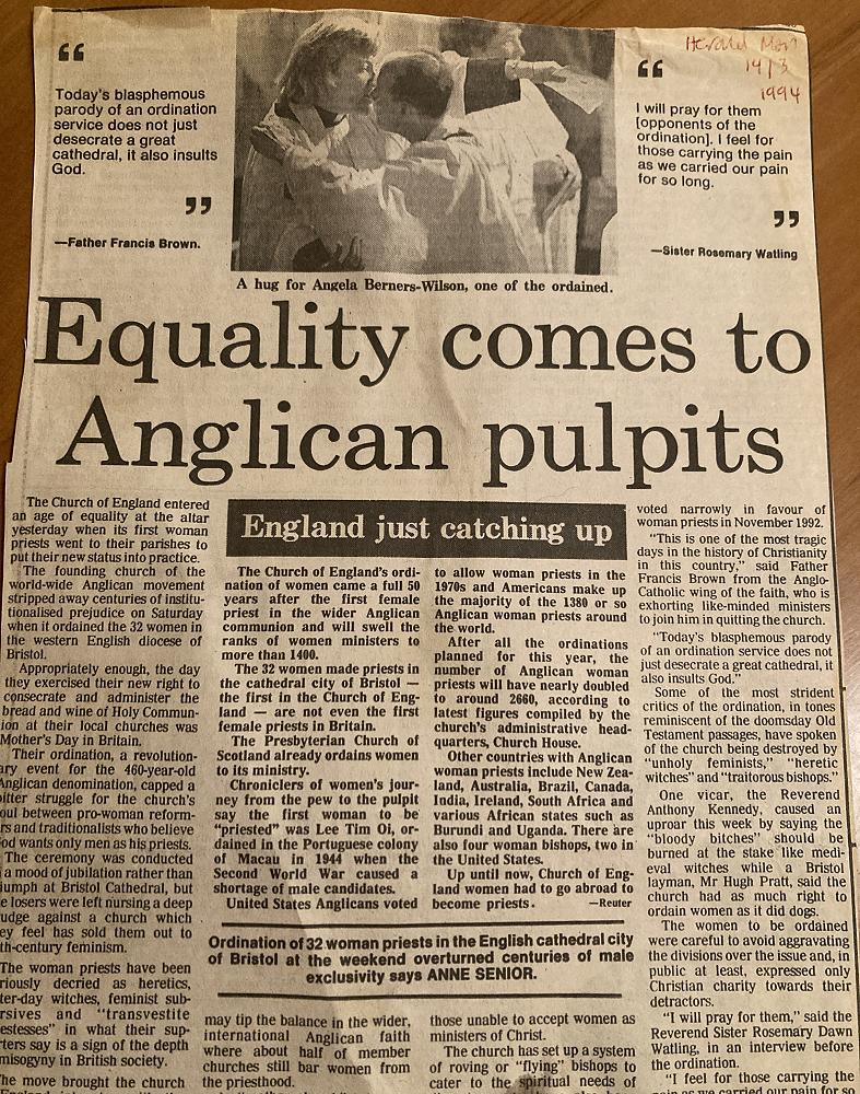The first Anglican woman in the world to be elected and ordained as a Bishop was Penny Jamieson and that happened right here in Dunedin in 1990! It has not been an easy journey over the last 2000 years of church history for women who felt called to church ministry (a serious understatement), and even in the 1990s this was still very difficult for many. In the 1990s, the Church of England in the UK was still debating whether or not women could be priests. In 1994, when 34 women were ordained in Bristol Cathedral by the male Bishops who supported them, Father Francis Brown said, “This is the one of the most tragic days in the history of Christianity.” Reverend Anthony Kennedy said the “bloody bitches” should be “burned at the stake like medieval witches,” while a layman, the rather aptly named Mr Hugh Pratt said, “The church had as much right to ordain women as it did dogs.”