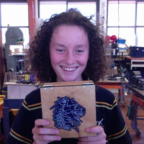 This is my wooden box that I made in e-Tech. I used white pine wood, rivets, nails, glue and acrylic. It is 150mm long,and 60mm high, and I varnished it. My favourite part is the acrylic dragon that I laser cut, and stuck in the lid. To do this, I cut out the shape for the dragon in the lid, then placed the acrylic dragon in the hole and hot glues it in place. I thoroughly enjoyed making this!