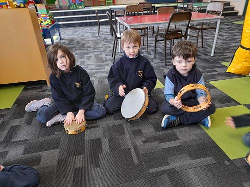 The tamariki had fun discovering that the tambourines could be played using different parts of their body - the hand, shoulder, arm, leg - even the feet!