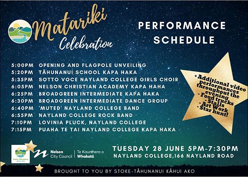 Matariki at Nayland performance times for Tuesday 28th June. Our Kapa Haka students are on first at 5pm - Make sure you get there to support!