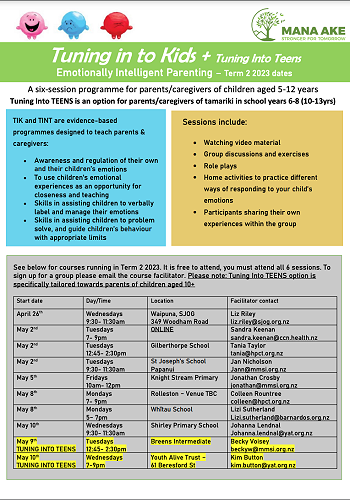 Mana Ake presents the Tuning to Kids Courses for Term 2, see that attached flyer for course times and details.