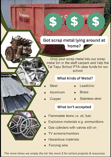 The Tai Tapu School PTA Invites the school community to fill the red bin situated in the staff car park with scrap metal.