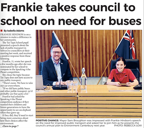 If you read the Selwyn Times you would have noticed another Tai Tapu super star. Frankie Hindson had the opportunity to share her Speaking 4 the Planet speech in the latest Selwyn Council meeting. Wow Frankie! Tai Tapu needs a public transport service and maybe with your efforts, we may just get one. Congratulations on your amazing achievement.