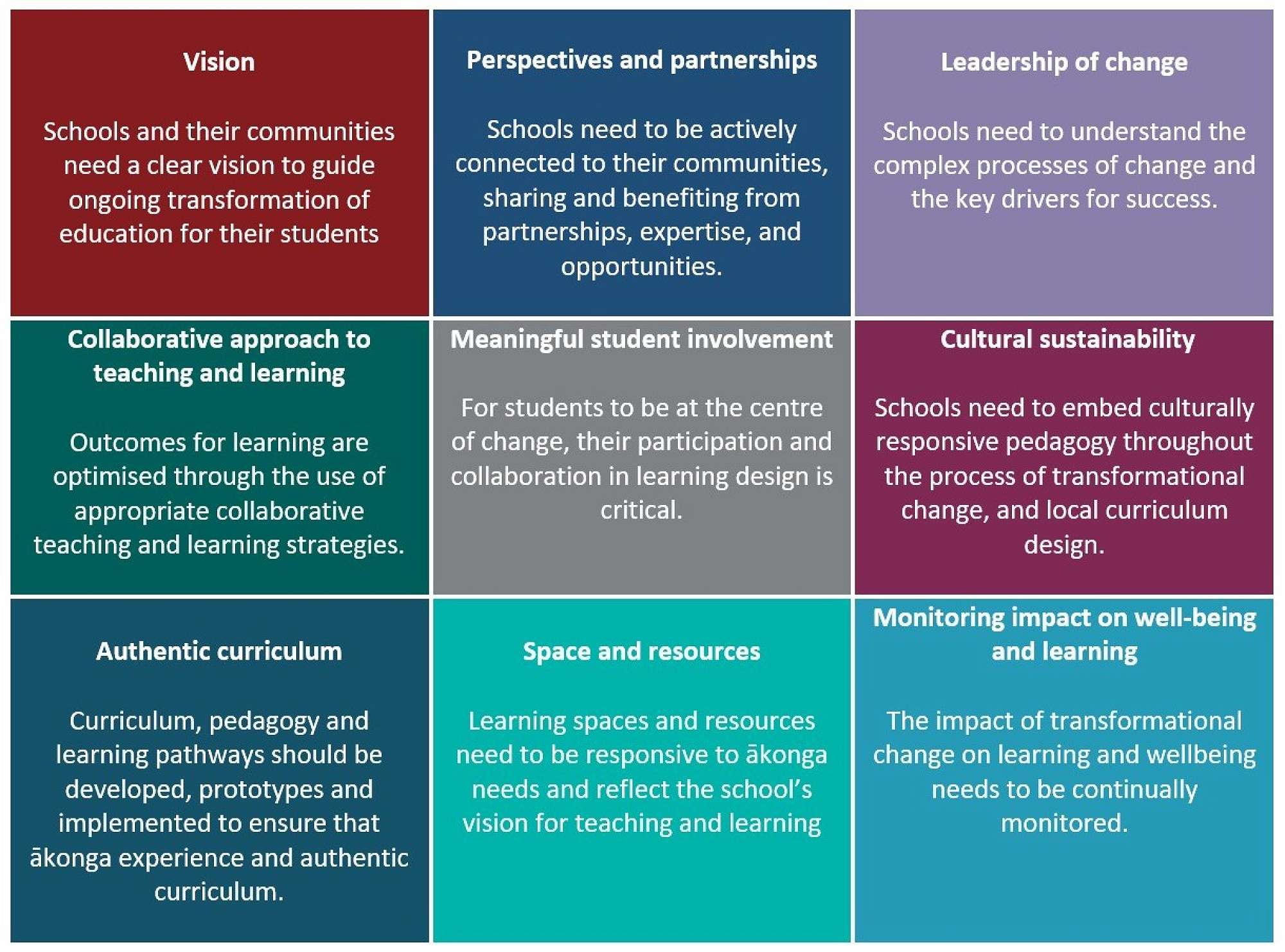 The kete is framed by nine principles related to kura and school change which are based on Te Whao | Monitoring and Evaluation Framework. Each of the nine principles are included as a separate section which hosts a range of practical, evidence based resources to provide ideas and support.