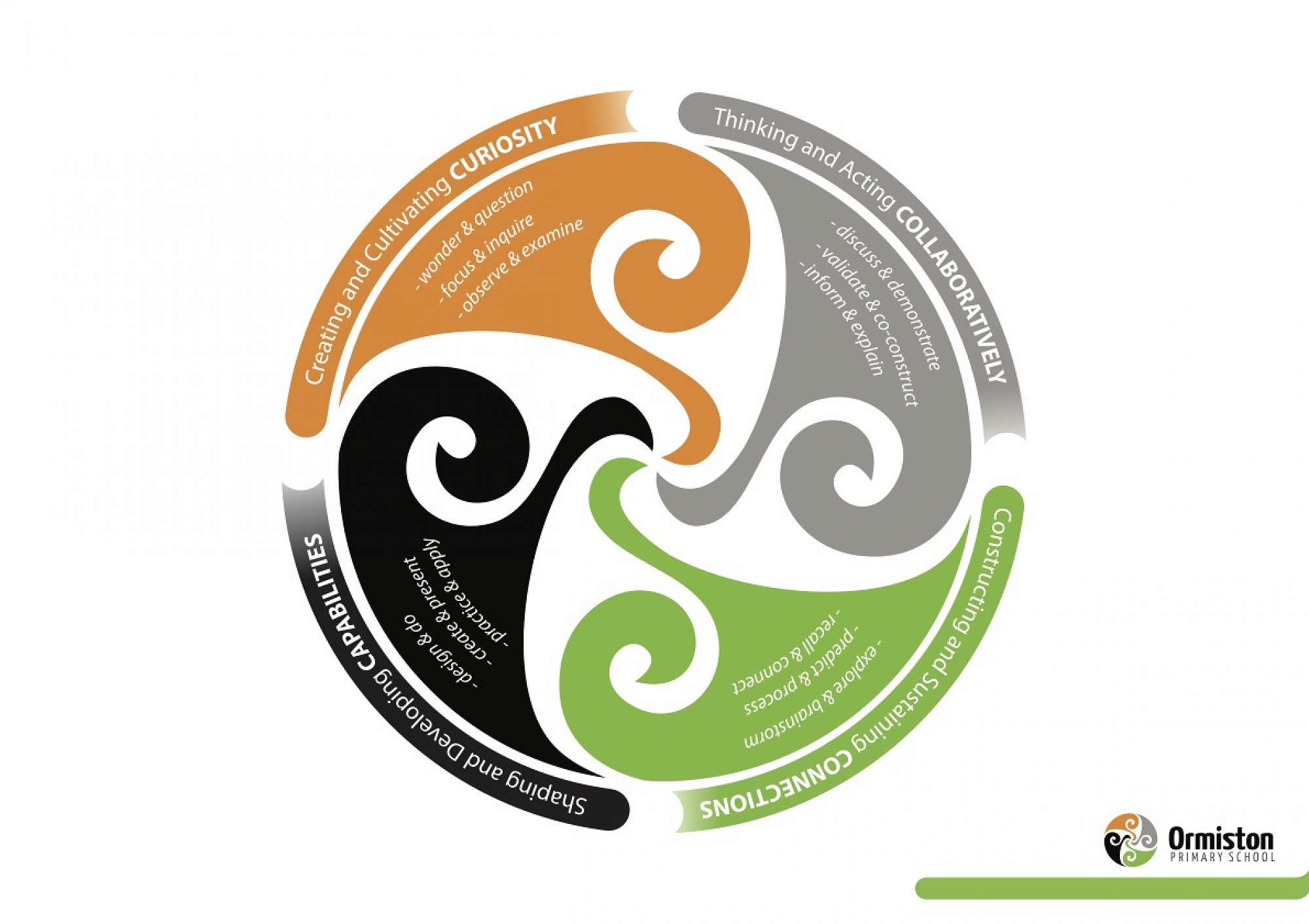 Ormiston Primary School learning is rooted in the vision, principles, values, key competencies & learning areas of the New Zealand Curriculum and our learners engage with this our day is designed with unique identities for each learning block: