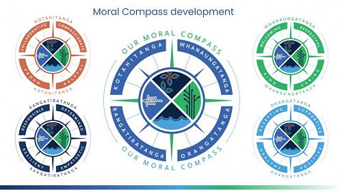 ‘Ākonga equipped to navigate their own journey’ - was the starting point of the visioning process. Once the Board had developed this vision they made it quite clear they wanted the Principal and Senior Leadership team and in time the rest of the foundation staff to develop this further, knowing that they would be the people who would have to live and breathe it every day. From there came the school logo, vision, mission statement, and moral compass. Everything that we do at our school is influenced by our compasses that outline how our school, our learners, our curriculum, our learning models, our inquiry process and our 'Getwise' programme operate.