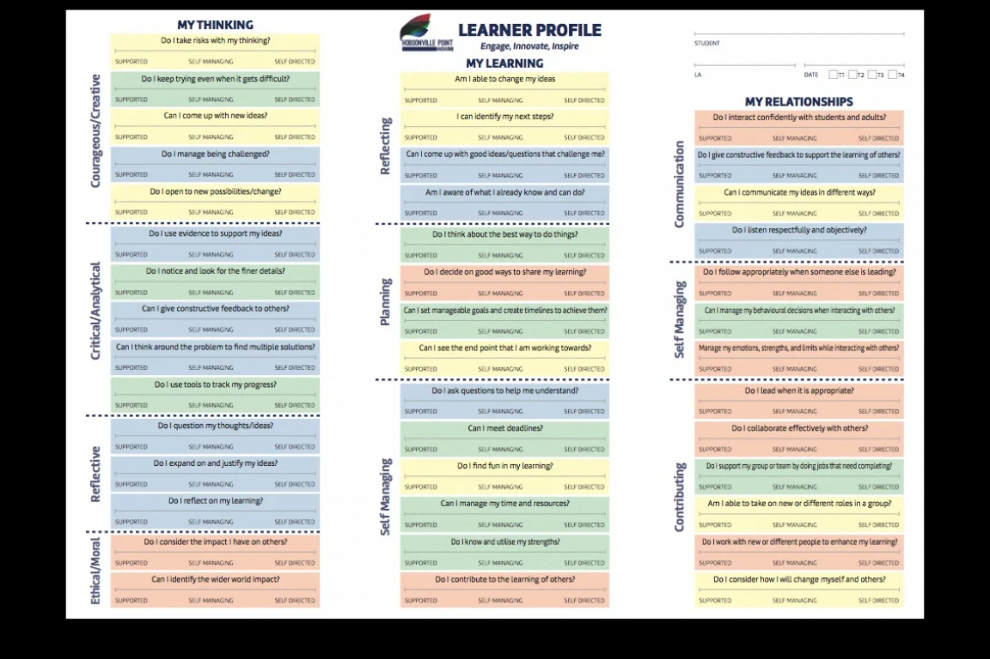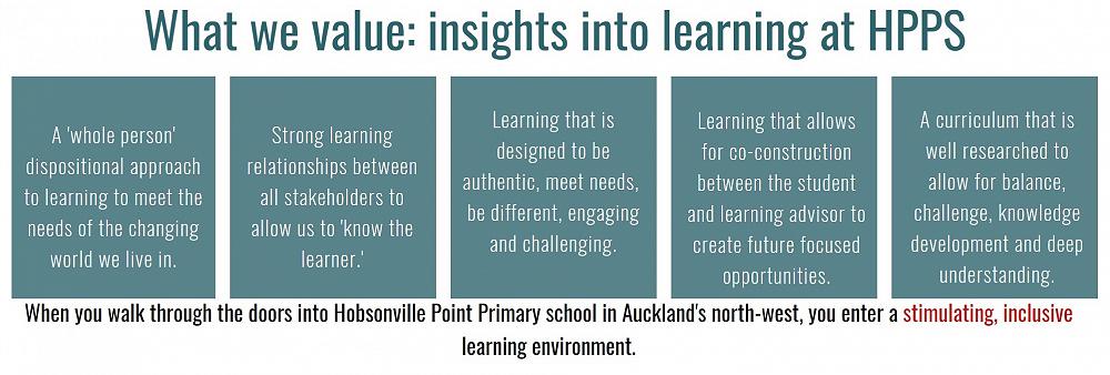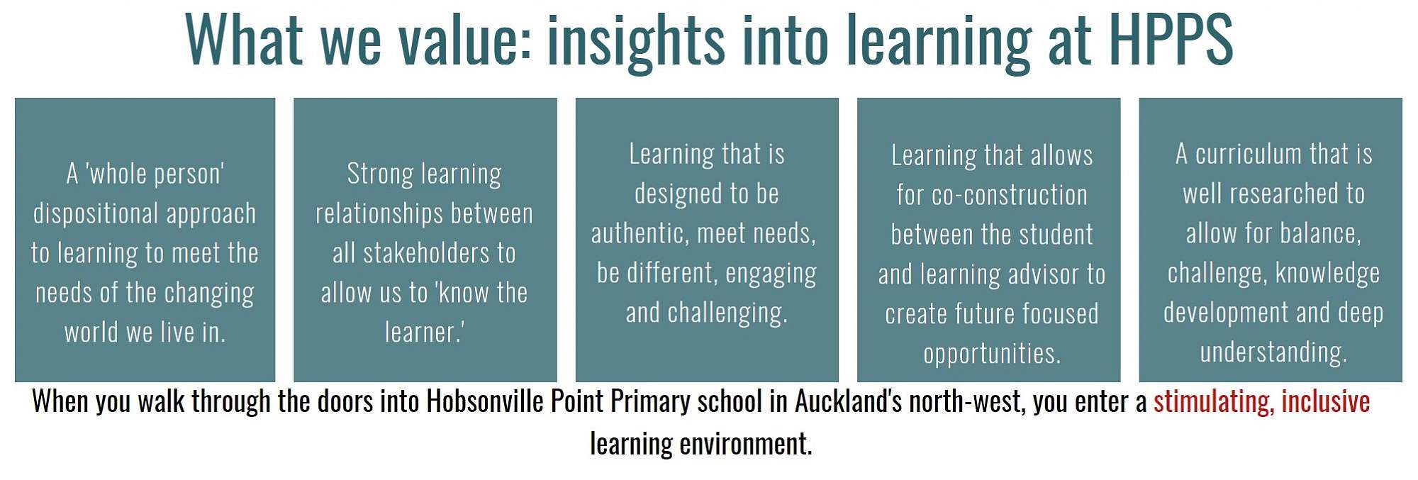 Students are active participants in the learning design. They can share what they are learning and why. Planning is shared with them so that they understand the big picture. Co-agency is encouraged, so staff and students come together to design appropriate learning for each student. Read more here: https://www.hpps.school.nz/our-learning We are currently refreshing our Learner Profile (see original below).
