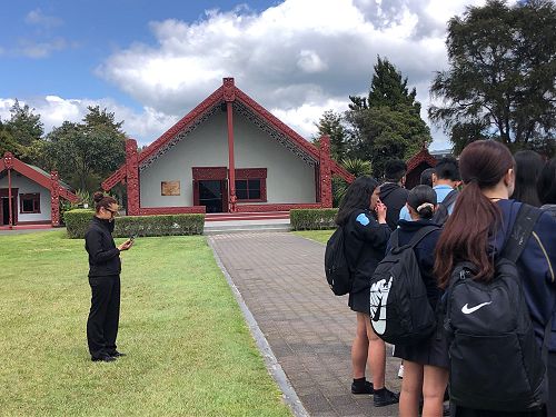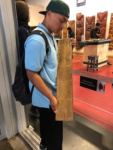 On tour, the students were shown through Te Puia’s carving school and Ta Moko studio and told how stories and messages are conveyed through carving and Tā Moko designs. They saw young carvers’ in action in the studio, using traditional tools on traditional materials. The carvings of parts of marae are a significant aspect of New Zealand Maori culture; In Maori history, carving itself was also a spiritual act surrounded in tapu.