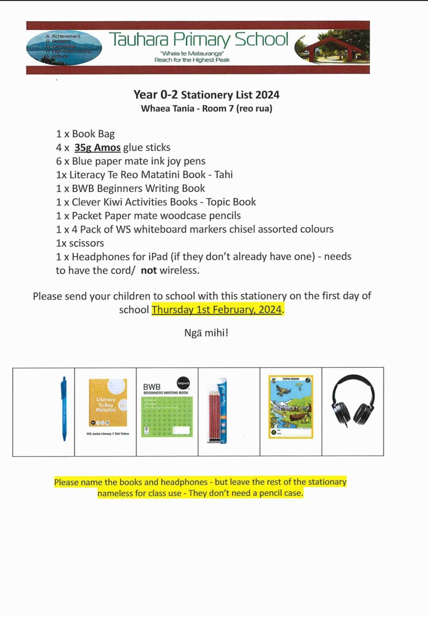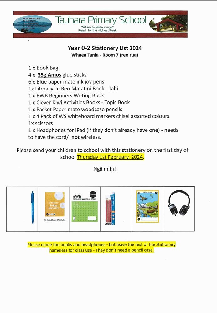 Stationery List Year 0/2 Reo Rua Tauhara Primary — December 12th, 2023 Whaea Tania (room 7 reo rua) Image by: Tauhara Primary