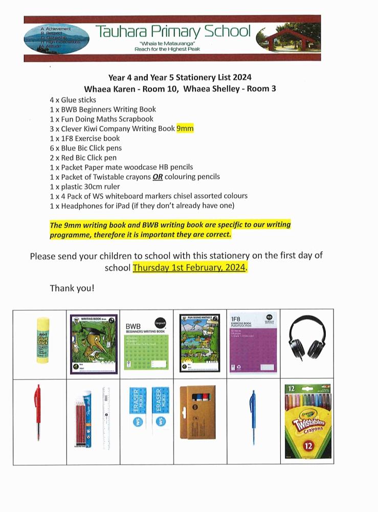 Stationery List Year 4 and Year 5 Tauhara Primary — December 12th, 2023 Whaea Karen (room10), Whaea Shelley (room 3) Image by: Tauhara Primary