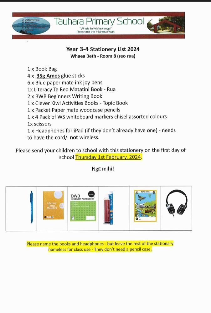 Stationery List Year 3/4 Reo Rua Tauhara Primary — December 12th, 2023 Whaea Beth (room 8) Image by: Tauhara Primary