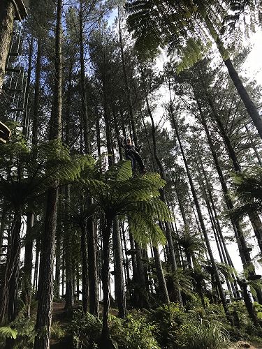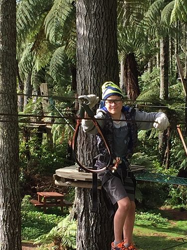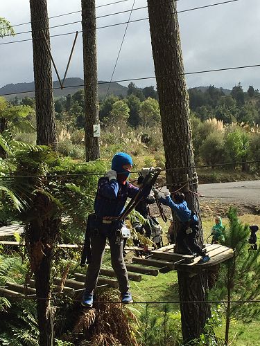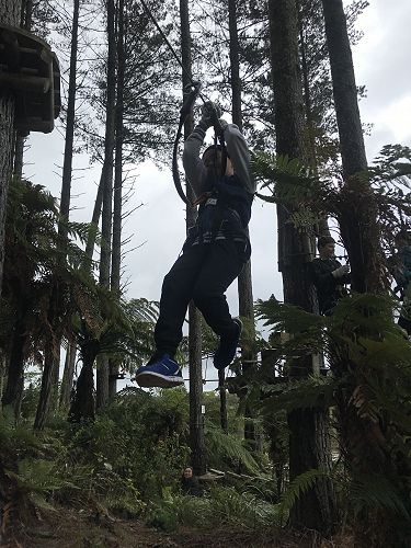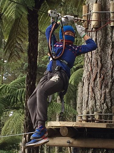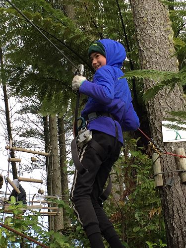 Manaaki: On our way to Adrenaline Forest we saw amazing land sites. When we got there got instructions for our harnesses. When the instructor told us there were six levels, everyone was excited. There were practice levels on the ground and after everyone had a go, we each started on level number one. We had our teachers and some parents for supervision, just in case.