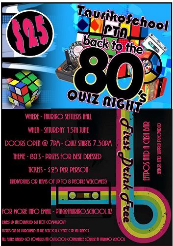 The Tauriko School Quiz night is a fun adults event that is held annually. Tickets for this years event are now on sale. There are great prizes up for grabs, a fun 80's theme and we can guarantee a great atmosphere - so we just need you to help make it a great night!