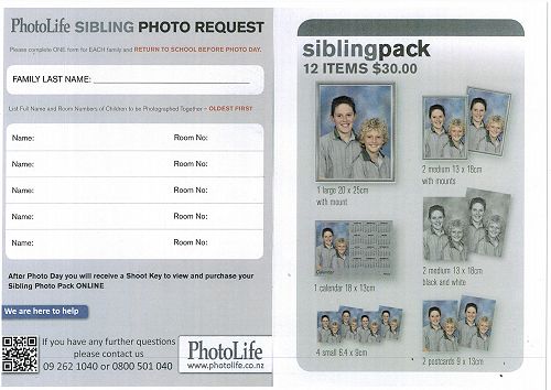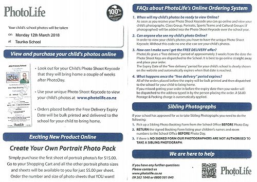 To view and purchase your child's photos online your child will bring home in a couple of week a Photo Shoot Keycode. Use your unique Photo Shoot Keycode to view your child's photos at www.photolife.co.nz. Order place before the Free delivery Expiry Date will be bulk printed and delivered to the school for your child to bring home. Please view the documents below to find out more about our 2018 school photos.