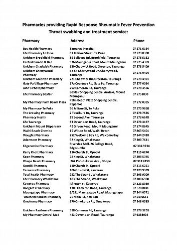 The Bay of Plenty Pharmacy Group is pleased to announce that 34 Pharmacies across the BOP DHB area are now providing Rapid Response Sore throat swabbing and treatment services for the management of Group A Streptococcal Pharyngitis. This service is part of the BOPDHB’s plan to reduce the incidence of Rheumatic Fever by two thirds in our area by increasing access to free, rapid, effective sore throat management through a combination of rapid response, general practice and school-based services. Community Pharmacies across the region from Waihi Beach, Katikati, Omokoroa, Tauranga, Te Puke, Kawerau, Edgecumbe and Opotiki including several extended hours pharmacies will greatly improve access to these services.