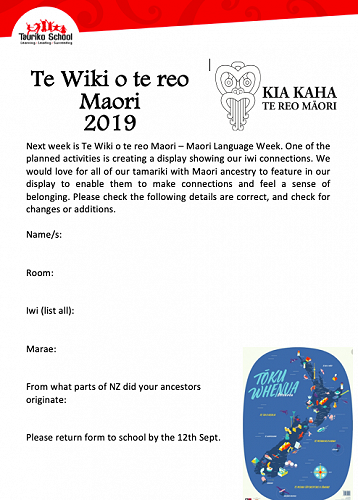 Over the course of the week we will be putting together a display showing the iwi connections of our students. Notes were sent home on Friday with students in our system who identify as Maori. These have the details we have on file of any tribal connections. Please check these over and add/amend and return to school as soon as possible. If your child has Maori ancestry and you did not receive a note, please email Jo Te Whaiti at jtewhaiti@tauriko.school.nz and we will make sure one is sent out to you.