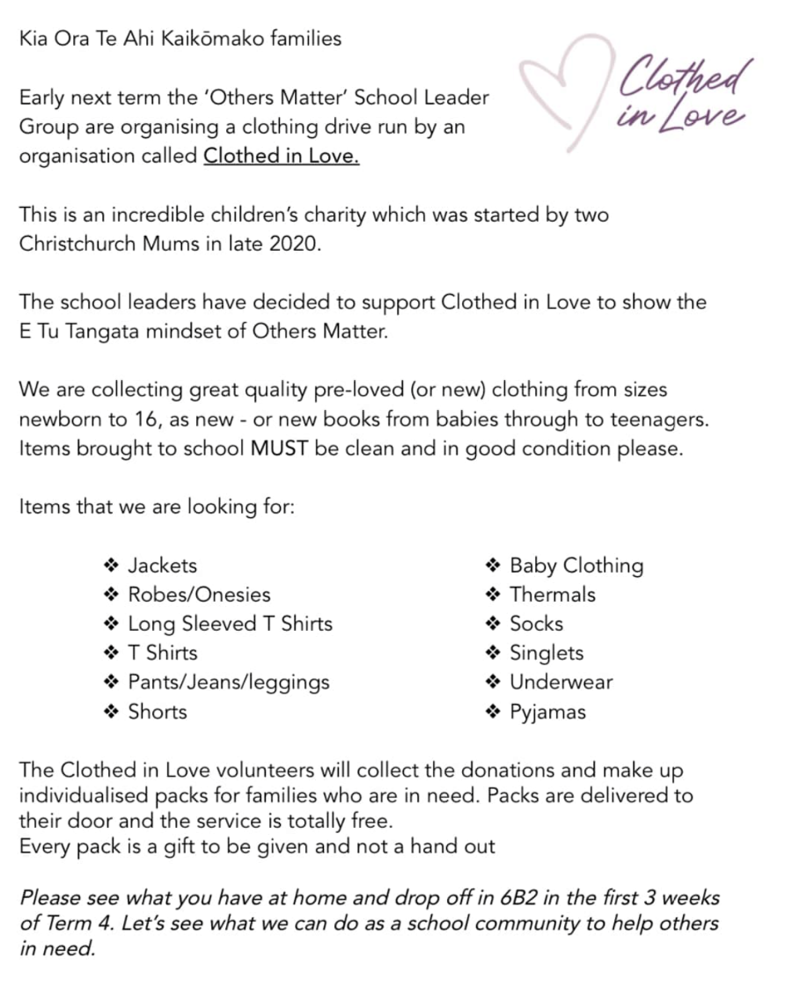 Our kura leaders are hoping to support a local charity but we need your help! Hopefully, the holidays were a great time to clear out clothes that our tamariki had outgrown. If your whānau has ‘spring cleaned’ the wardrobes and drawers, we would love the discarded items. Please have a read of the flyer below.