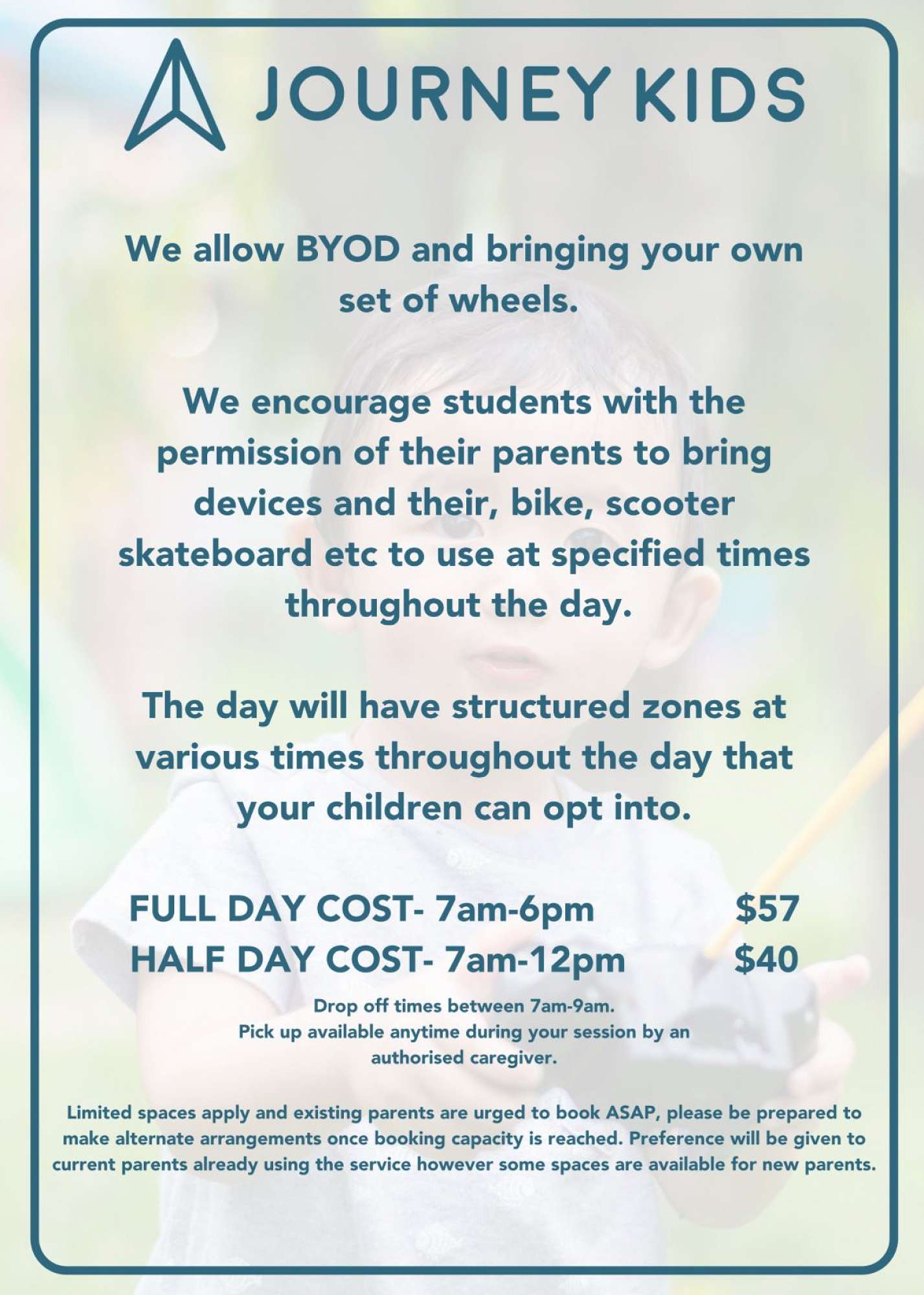 Spaces are limited so register online ASAP (www.journeykids.co.nz - click "BOOK NOW"). Please see the attached flyer below for more information.
